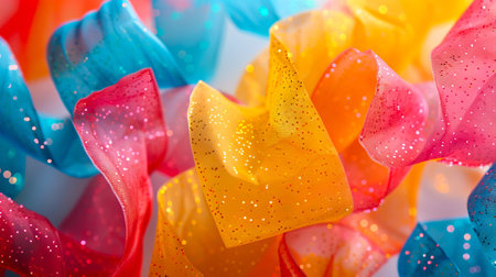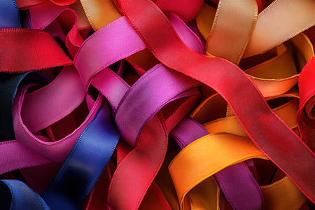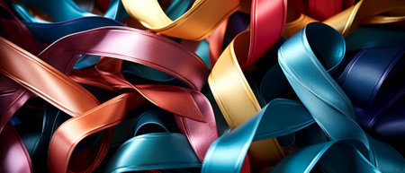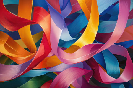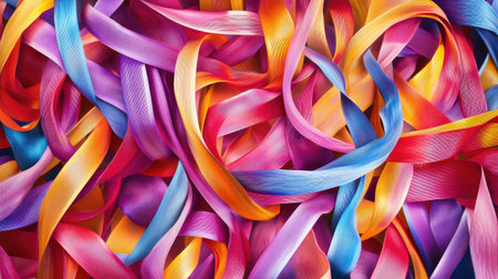 A captivating close-up of colorful ribbons intertwined in a dynamic, vibrant pattern. Perfect for artistic projects, celebrations, and backgrounds.