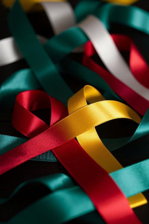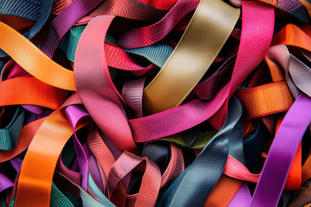Close-up of various gift ribbons with a focus on texture and color variations, great for detail-oriented themes,