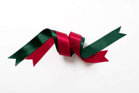Red and blue gift ribbons entwined on a white background