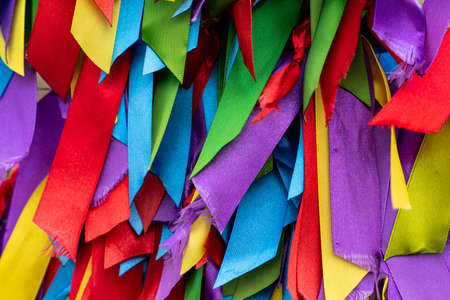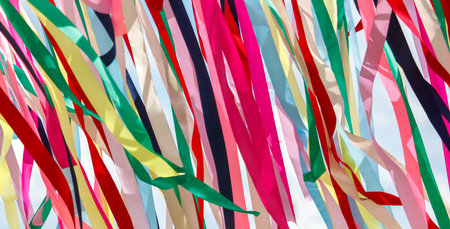 Multicolored festival ribbons flutter in the wind. Background.