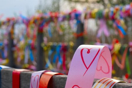 Funny multicolored ribbons on the fence with a red heart with selective focus and blurred background