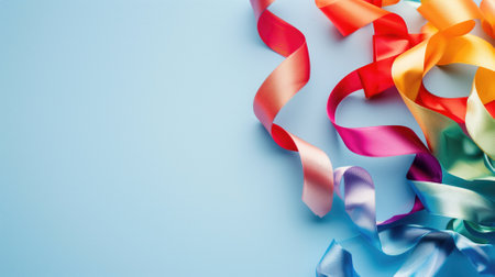 Colorful satin ribbons arranged in curvy patterns on blue background