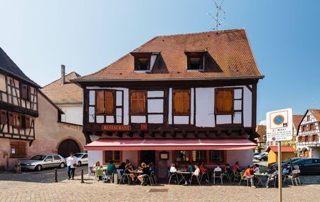 Bergheim, France - 19 Apr 2019: Traditional French restaurant Brasserie La Mosaique serving food to people customers at the outdoor terrace on a warm sunny day