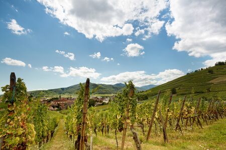 Rows of grapevines in the vineyards along the famous wine route in Alsace, France