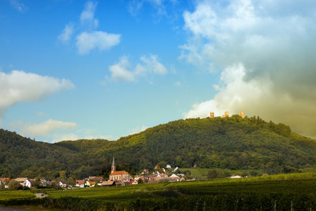Fortified castles and village of Husseren-les-Chateaux famous wine village along the wine route in Alsace, France
