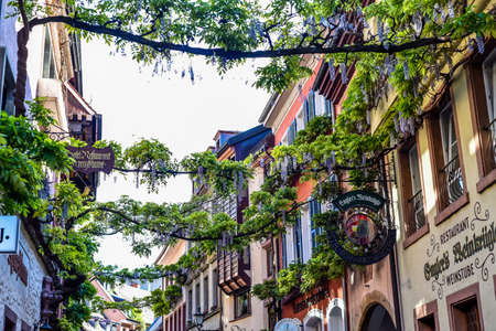 FREIBURG IM BREISGAU, GERMANY - May 17, 2017: old town street in Freiburg, a city in the south-western part of Germany in the Baden-Wurttemberg state.