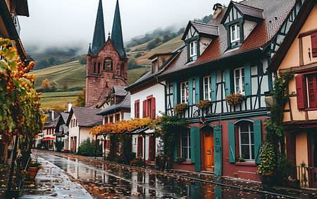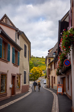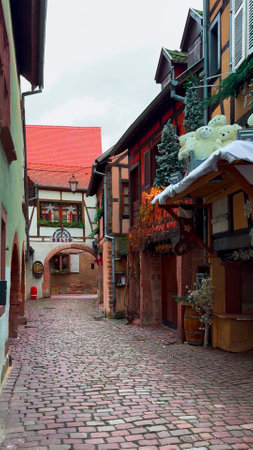Eguisheim, France - October 4, 2021: scenic small road with half timbered houses in the historic village of Eguisheim in the Alsace region in France.