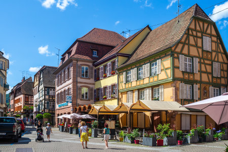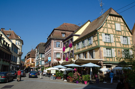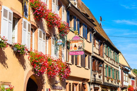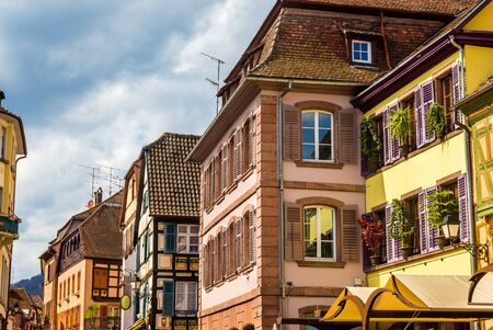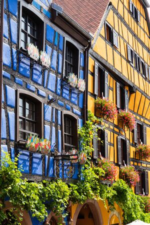 ALSACE WINE REGION, FRANCE - SEP 20, 2019: Colorful houses decorated with flowers in Kaysersberg village which is located on Alsatian Wine Route, France.
