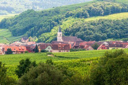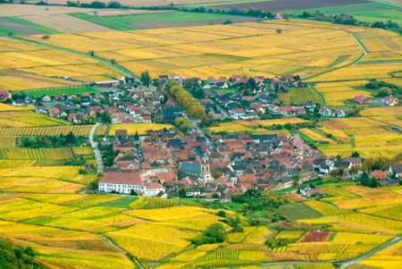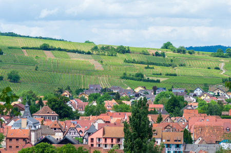 Rural landscape of Alsace in France. The small medieval town of Rosheim and its vineyard-covered hills.