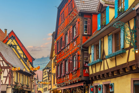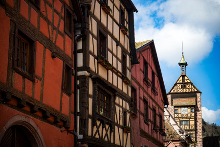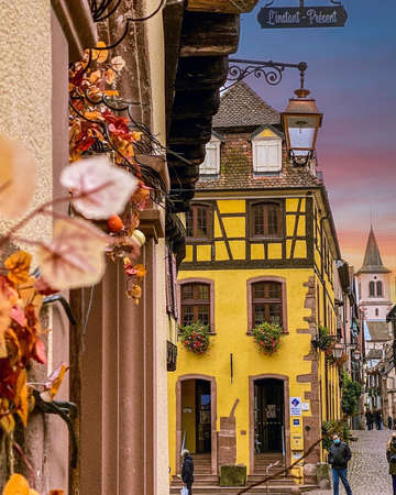 Riquewihr, France - October 24, 2021: Traditional half timbered facade and colorful beautiful architecture in Riquewihr village, Alsace region, France