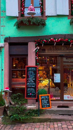 Christmas and New Year street decorations Christmas market Riquewihr or Reichenweier, Alsace, France December 25, 2023.