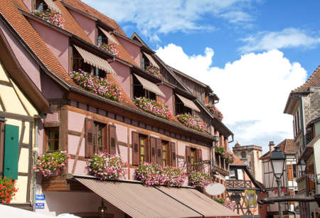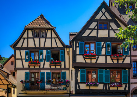 Ornate traditional half timbered houses with blooming flowers in a popular village on the Alsatian Wine Route in Kaysersberg Vignoble, France