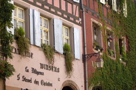 18 June 2012. Ribeauvillé village with colorful traditional half-timbered french houses, Alsace, France
