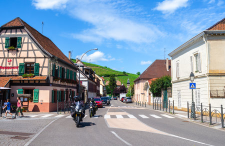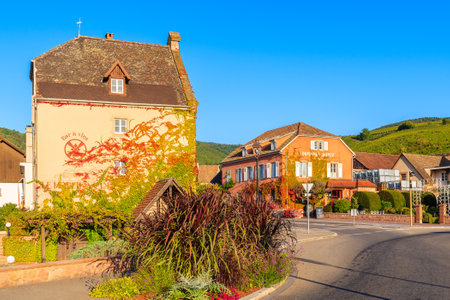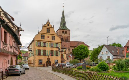 BEBLENHEIM, FRANCE - SEP 18, 2019: Beautiful historic houses in old part of Beblenheim village which is located on famous wine route in Alsace region of France.