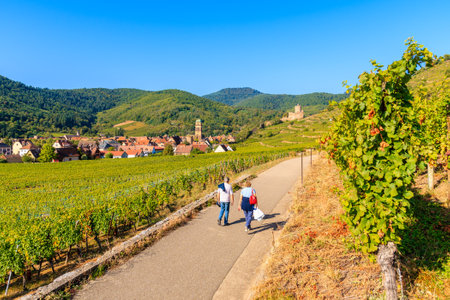 Couple of unidentified people walking among green vineyards to Kaysersberg medieval village on Alsatian Wine Route, France