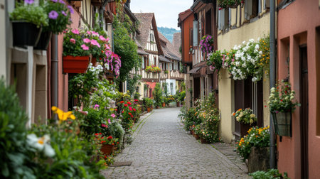 A picturesque cobblestone street features charming houses with colorful flower boxes, creating a delightful atmosphere in a serene village setting during spring.