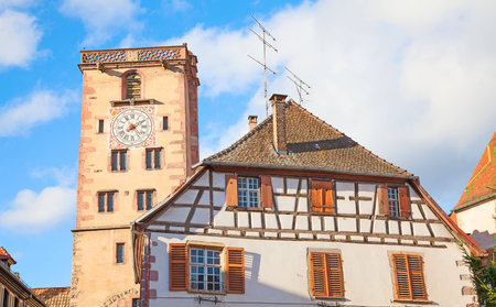 Cityscape view on the old village with medieval tower in Obernai town in Alsace region, France