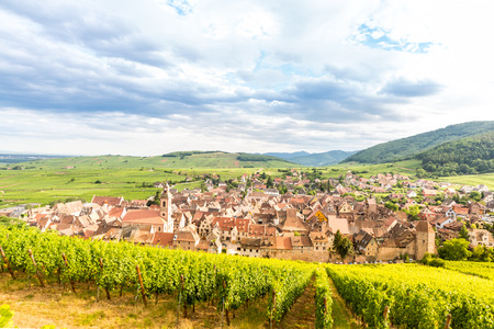 Riquewihr in Alsace, France. Enchanting medieval village, along the wine road that connects Colmar to Strasbourg. View of the vineyards from the old village within the walls.