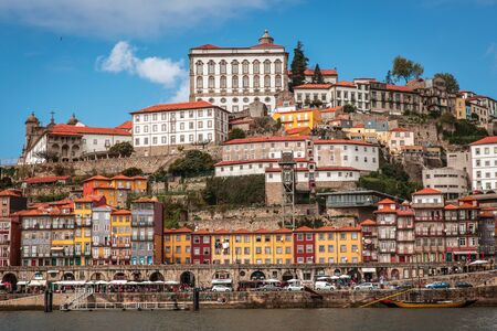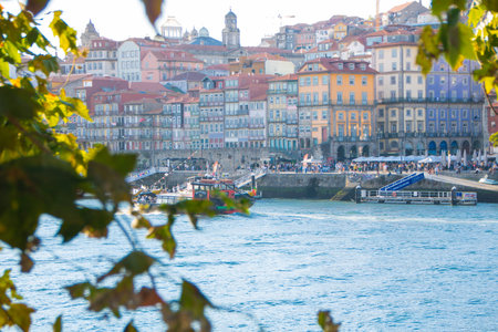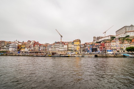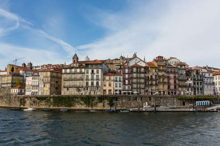 Porto, Portugal - October 23, 2020: View of the buildings with typical architecture on the Douro river on an autumn day
