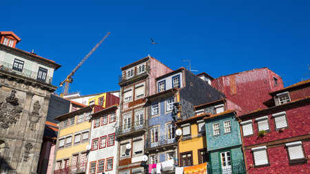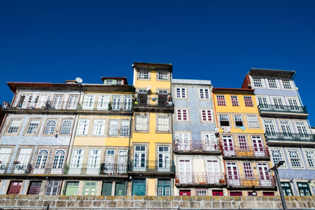 Colorful Traditional Buildings with Tiled Facades under Clear Blue Sky. Trip to Porto in Portugal.