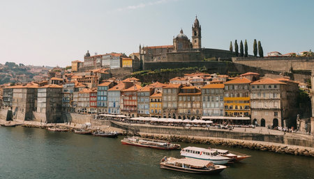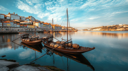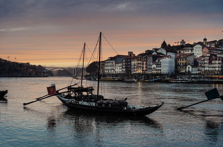 Stunning view of Porto city and the Douro River with traditional boats carrying port wine barrels from the Marginal de Gaia riverfront