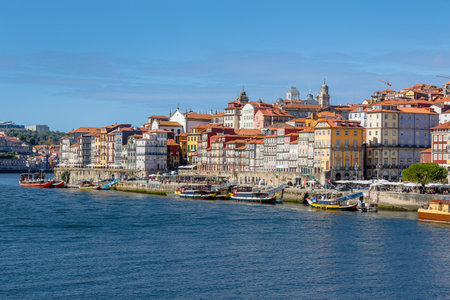 Porto, Portugal - September 11, 2021: View of Ribeira historical quarter on the margin Douro river embankment in the old town of Porto, Portugal.