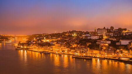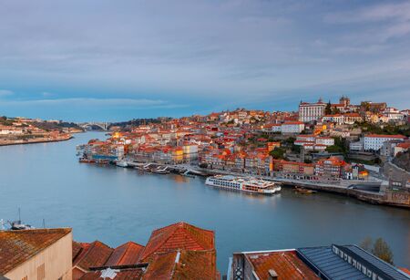 View to the historical part of the city of Porto at blue hour. Clear sky. Night cityscape. Porto, Portugal.