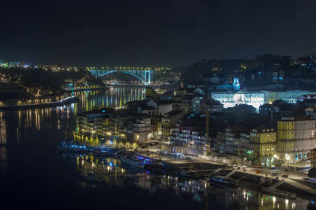 Views of Douro river and Ribeira from Dom Luis I Bridge at night time, Porto, Portugal.