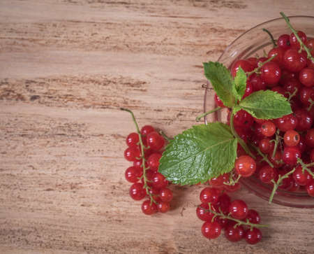 Close up with red currants berries on wooden table. Copy space background
