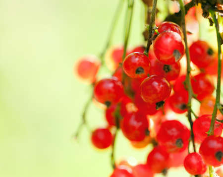 A close-up picture of a juicy red currants on a green background