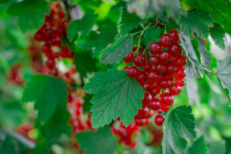 Juicy ripe red berries of red-flowering currant hanging on branch of bush with green leaves in garden. Vitamins, summertime, harvest, preservation, vegetarian, nature concept. Soft focus, copy space.