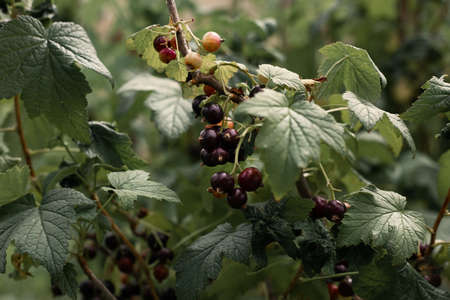 Berries of black currant on the green bush in garden outdoor
