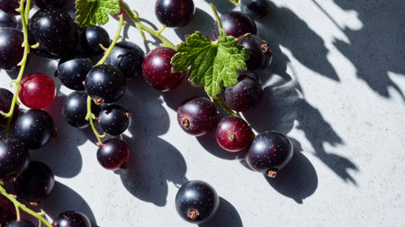 A stunning arrangement of fresh blackcurrant and redcurrant berries showcases their vibrant colors and textures against a grey surface with intricate shadows.