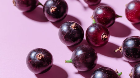 Vibrant black currants lay on a soft pink background, showcasing their smooth texture and rich color. Perfect for culinary inspiration or healthy eating concepts.