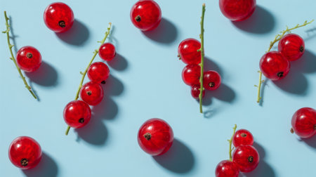This captivating image showcases fresh red currants arranged artfully on a serene blue background, highlighting their vibrant color and natural appeal as a healthy food choice.