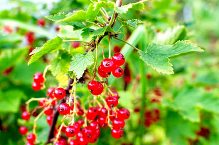 Colorful red currant ripe fruit on plant branch.