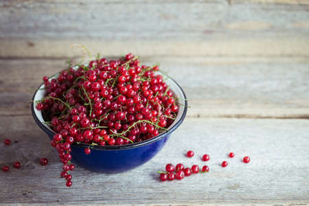 red currants in an enamel pot on wooden background