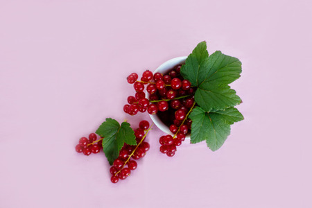 Sprigs of red currants on white. Berry background. Top view. Copy space