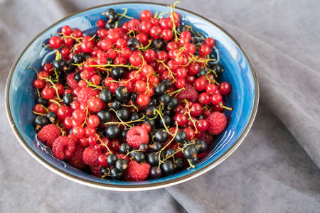 Red and black currant and loganberries on the blue plate and gray background. Large group of colorful berries.