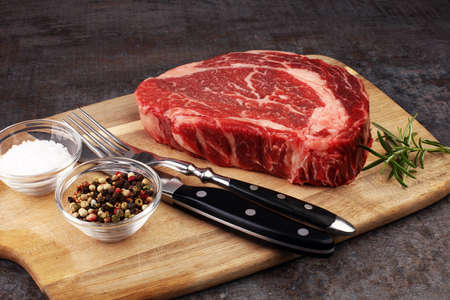 Raw rib eye steak on brown wooden board
