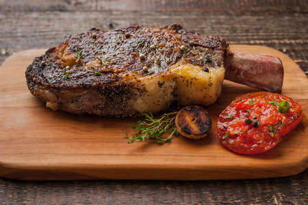 Rib eye steak, cherry tomatoes, garlic, herbs on wooden background