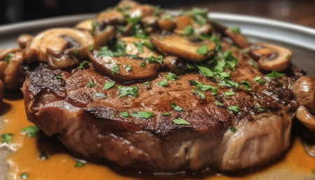 Grilled sirloin steak with mushroom and vegetables generated by artificial intelligence