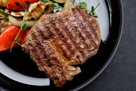 Meat steak with grilled vegetables on a black plate. Zucchini, onion, bell pepper