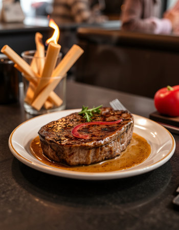 Grilled beef steak with potatoes and tomatoes on a plate in a luxurious restaurant with a luxurious bistro interior.