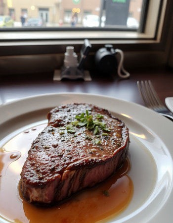 steak with rosemary on a plate in a restaurant or cafe