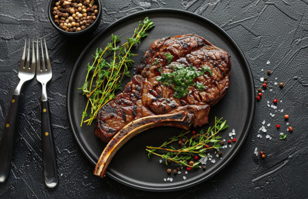 A close-up image of a perfectly grilled bone-in steak with herbs and spices on a black plate.