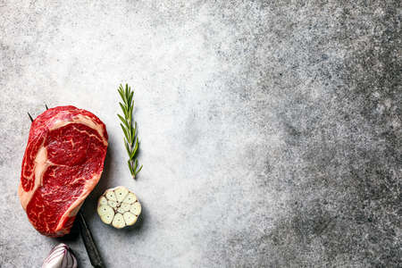 Fresh meat. Raw beef rib eye steak ready to cooking over gray background with copy space