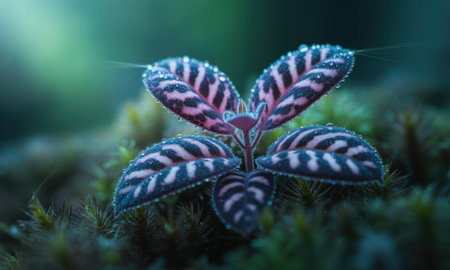 A macro photograph of lush green plant leaves covered in tiny water droplets. A small new leaf shows hints of red and orange against a dark, atmospheric background.