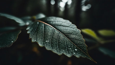 A detailed close-up shot of a lush green leaf, highlighting its intricate veins and texture. Tiny water droplets from rain or dew rest on its surface against a dark, moody background.