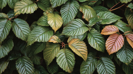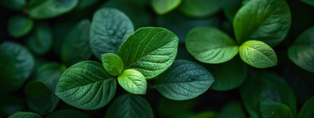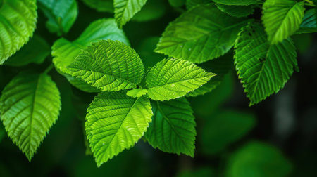 Lush Green Leaves with Intricate Veins Stand Out Against a Dark Background in a Dense Forest Scene